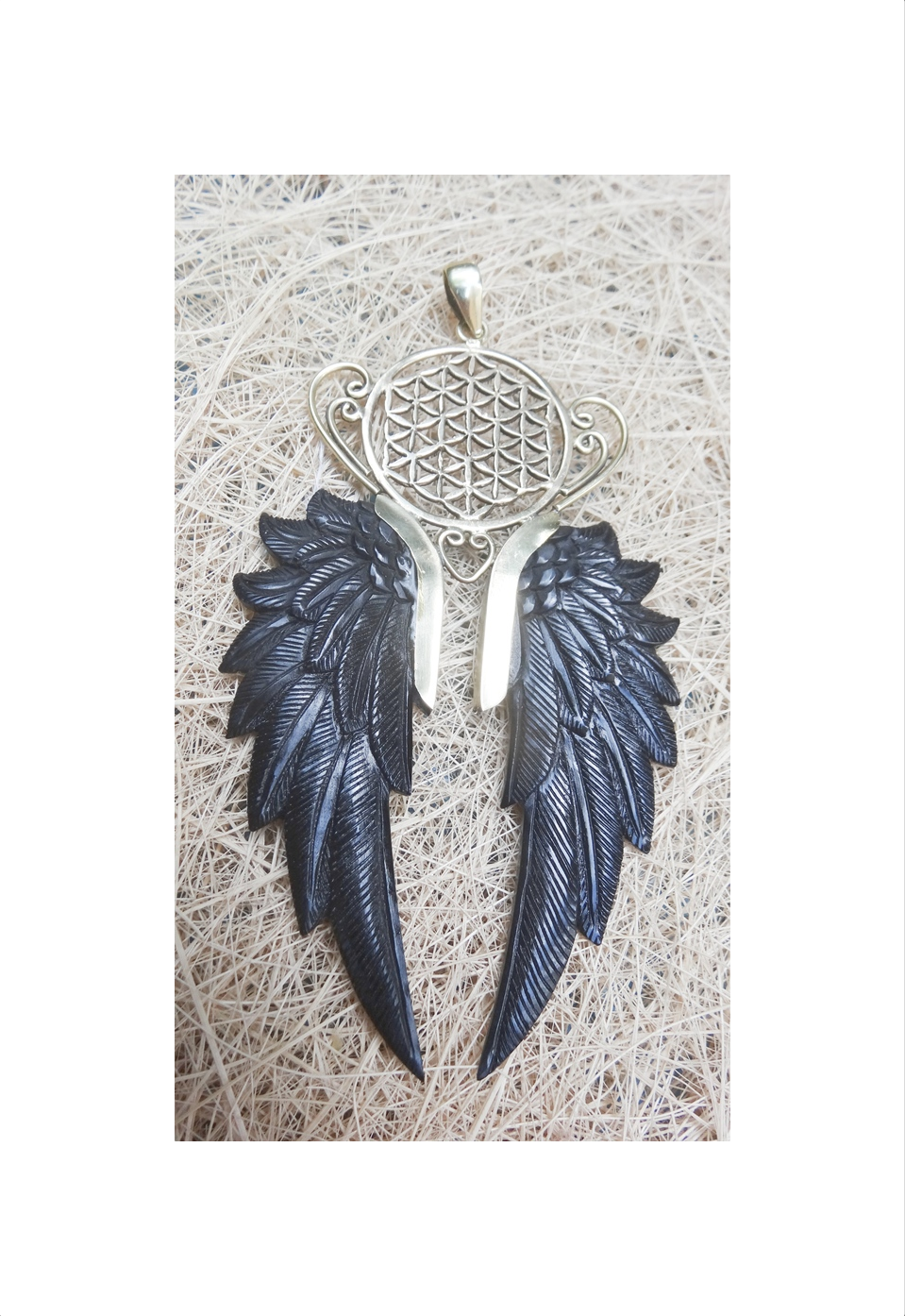 Angel Wings Pendant Carved Horn Unique Handmade Flower of Life Necklace