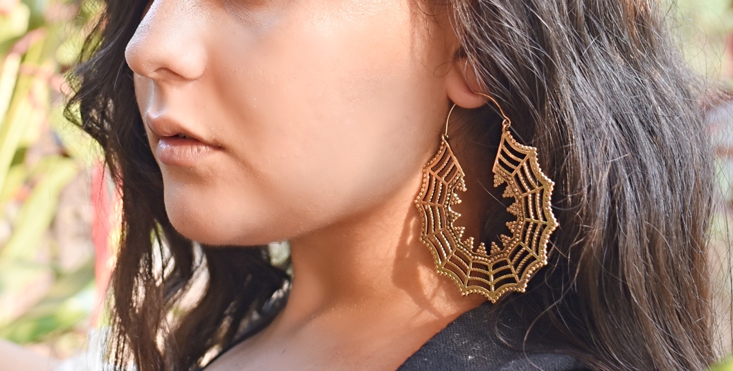 Dangle Drop Earrings Gold Brass Spider web Large Hoops.