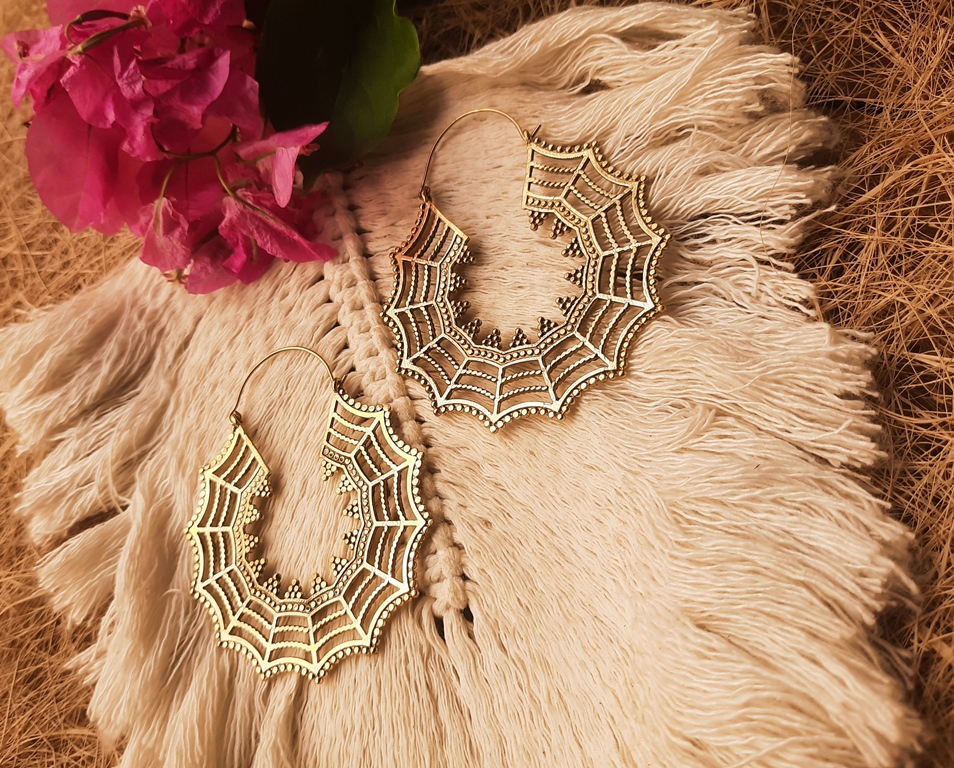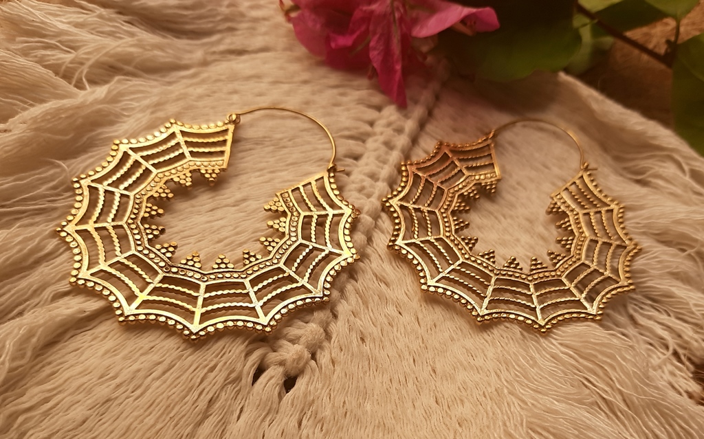 Dangle Drop Earrings Gold Brass Spider web Large Hoops. Skillfully crafted into unique brass 1mm gauged earrings that will fit naturally on the ear. These earrings weigh 9.25g each earring. They are 6cm by 6cm in diameter. Beautiful and unique tribal design earrings, fine and delicate handmade jewelry.