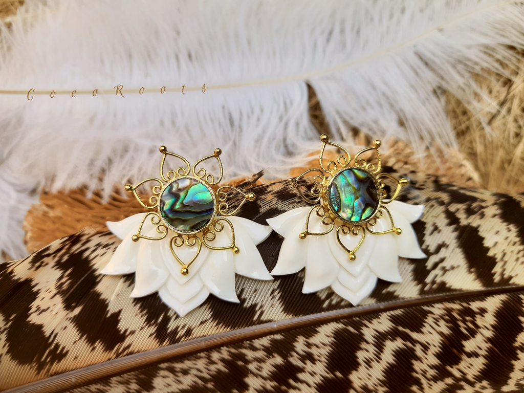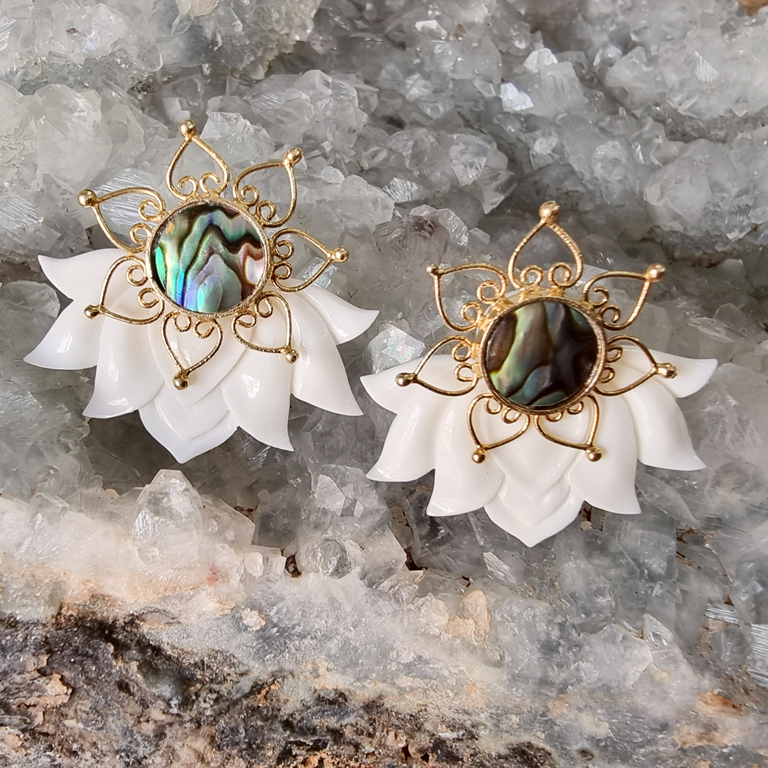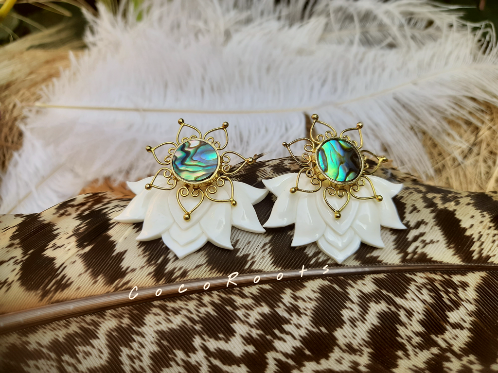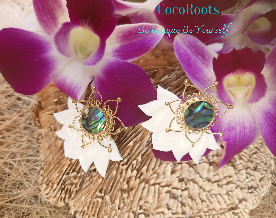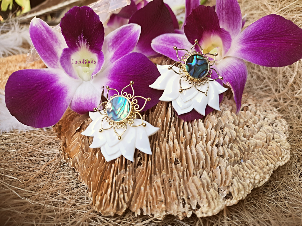 Lotus Earrings Flower Ear Unique Hand-Carved Lotus Flower with Abalone Shell Stud. Beautiful and unique Lotus Flower Earrings design, fine and delicately handmade. Especially crafted into unique earrings studs that will fit naturally on the ear.