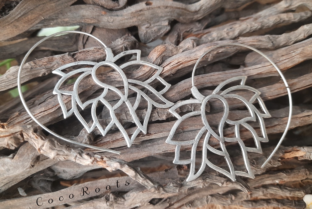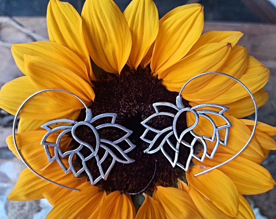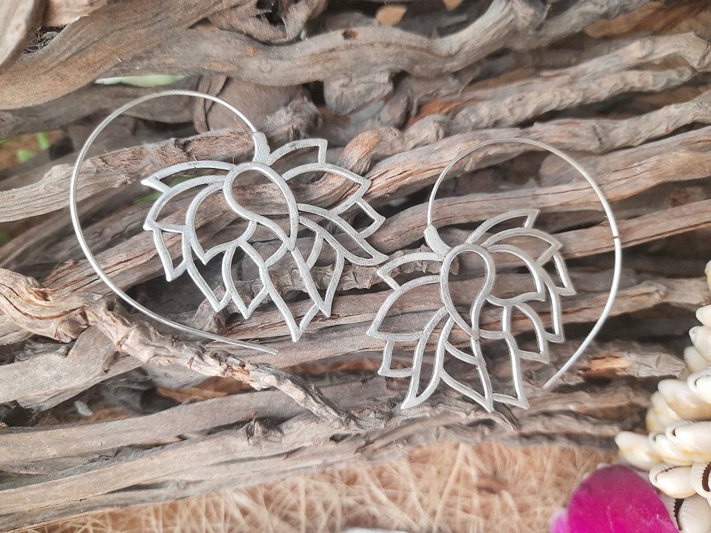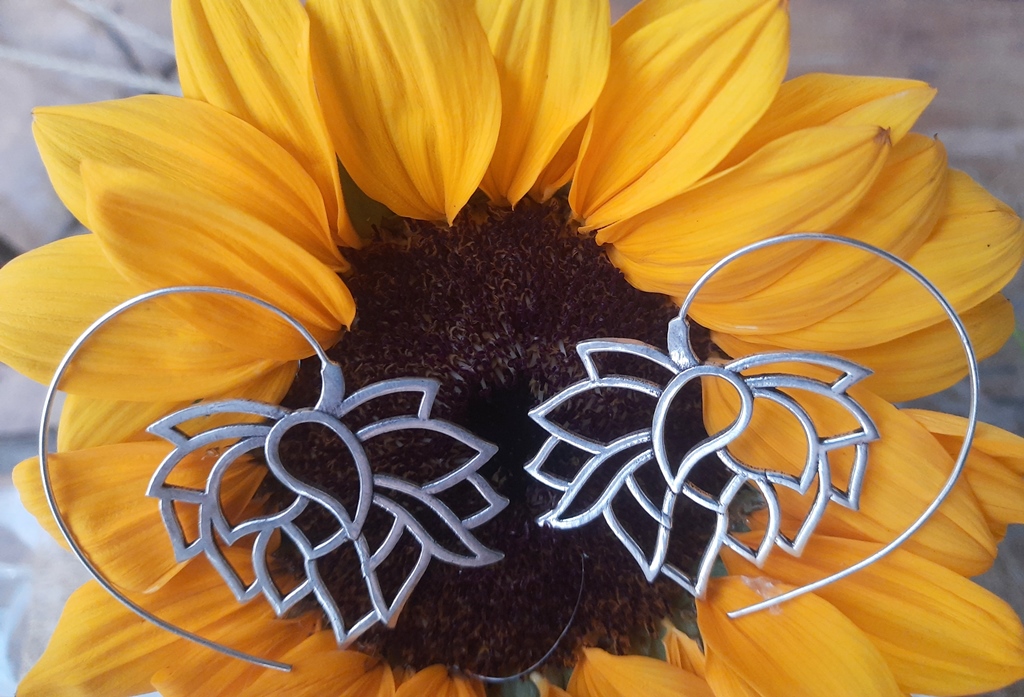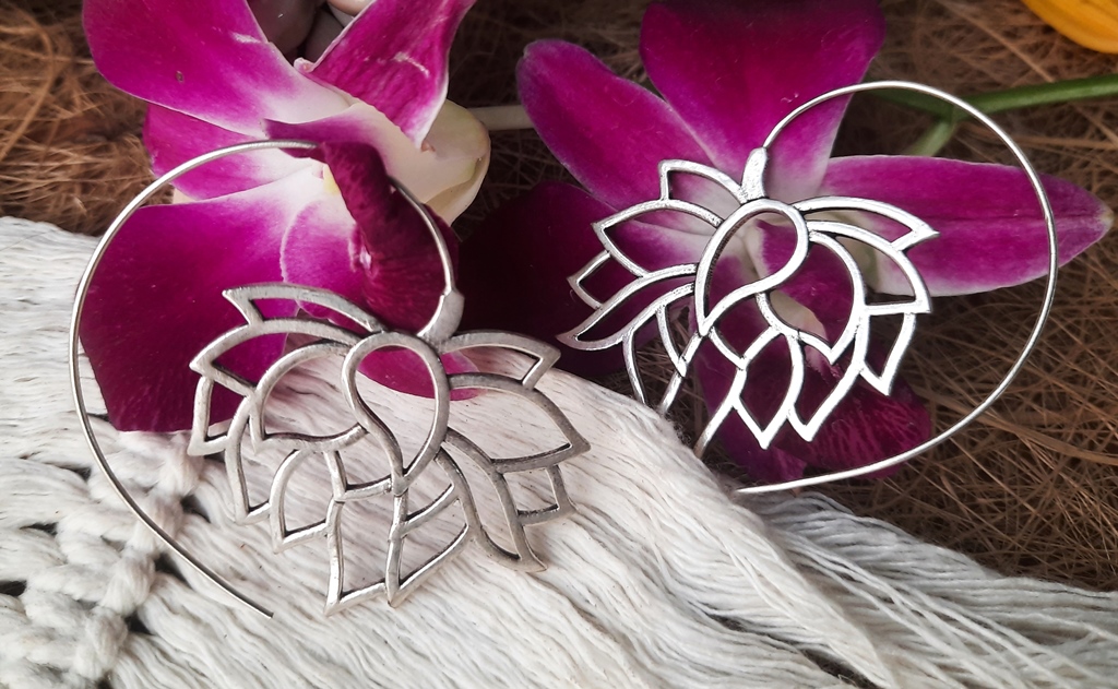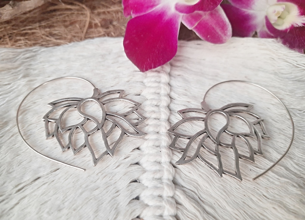 Silver Lotus Earrings Unique Spiral Tribal Hoops
