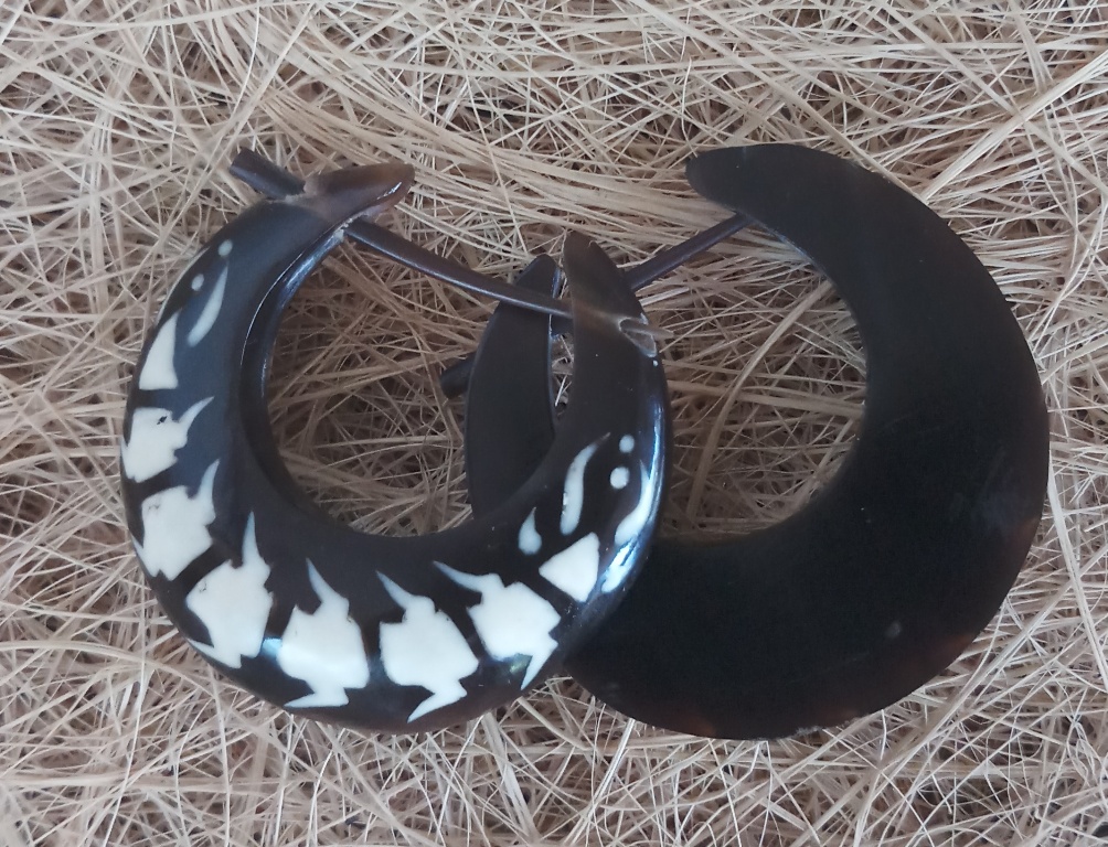 Tribal Horn Earring Half Moon Centipede Bone Inlay Handmade Jewelry. This product has the same shape and design as another product in this catagory. This product is also flat on the non-inlayed side. However, this product only has inlay on one side of the earring while the others have inlay on both sides. This is perfect for people who want a more simple earring.
