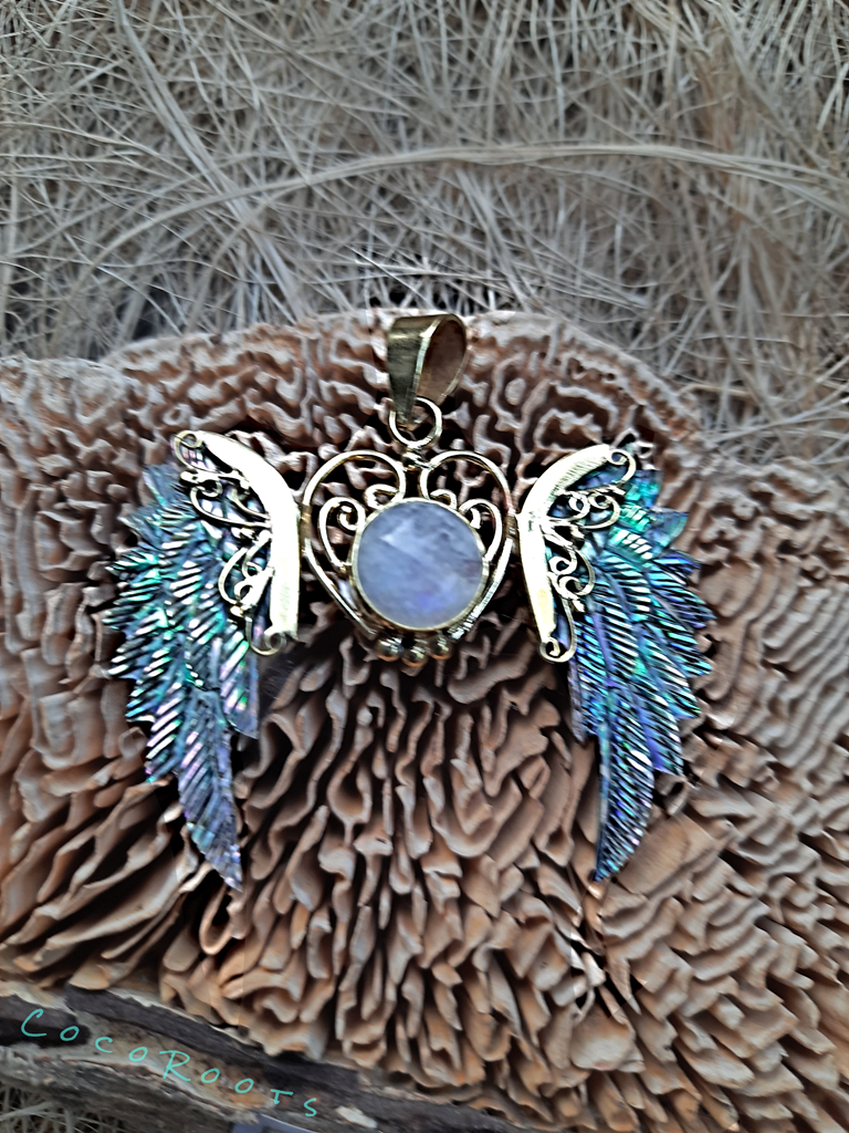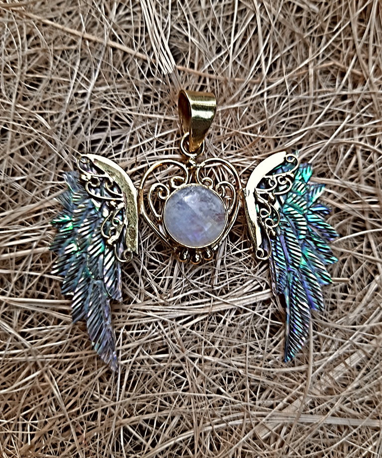 Unique Angel Wings Abalone Pendant Moon Stone Jewelry. The moonstone was considered very sacred in India. It is seen as a symbol of good luck. The ever-changing white reflections on its surface seemed to suggest a powerful, good spirit dwelt within.